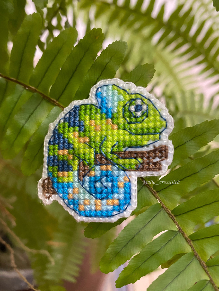Совсем недавно мне на глаза попался этот малыш-хамелеон от фирмы Наборы для вышивания «Овен» Великий Новгород Набор отшила за один день, в нем около 400х (без учета сшивания по контуру). В набор входит все необходимое: нитки пнк Кирова 9 цветов (только солиды), кусочек пластиковой канвы, кусочек фетра, застёжка, цвето-символьная схема. В наборе перепутаны 2 цвета синий по спинке и голубой по хвосту ( если смотреть на привью, мне на привью результат понравился по этому я их поменяла местами). Ниточек хватит ещё как минимум на 1 отшив, но мне кажется и на 2 хватит😉 Привью у набора обесцвечено, в жизни он намного ярче и интереснее) #значокхамелеон #хамелеон #вышивкакрестиком #вышивка #вышивкакрестом