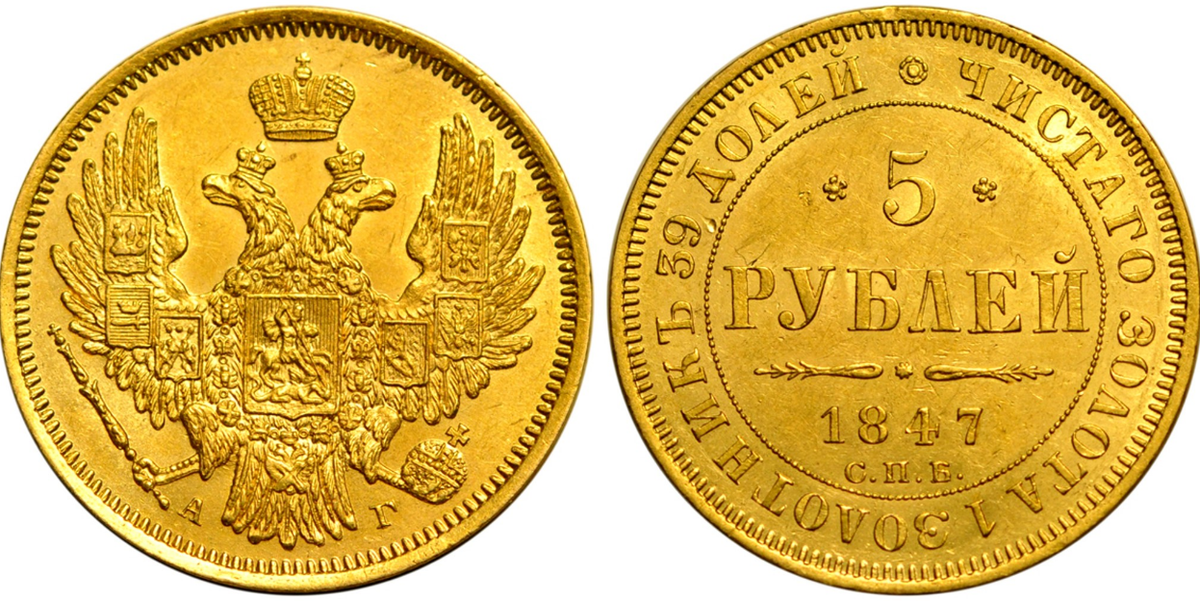 Всем, привет! Меня зовут Лев. Я являюсь нумизматом. Сегодня я хочу обсудить еще одну очень интересную монету. 5 рублей 1847 года. Монетка 5 рублей 18347 г. целиком и полностью состоит из золота 917 пробы. У каждой стороны монетки есть выпирающий кант зубчики, которого направлены вниз. Герб Российского государства 1830. находится в середине лицевой стороны монетки. На этом гербе изображен орел с двумя головами. На каждую голову одета корона императора. Выше находится корона, e которой из отличий с нижними двумя только размер. В орлиной правой лапе находится скипетр, в другой лапе у орла лежит держава. Герб Москвы находится прямо у орла на груди: на гербе изображено сражение Георгия победоносца и злого крылатого дракона. Святой Георгий втыкает свое копье во время езды на лошади. На этом гербе лежит цепочка Святого Андрея. На каждом крыле орла видны по 3 царства. На правом крыле гербы таких держав: Польской, Херсонеса Таврического и могущественного Финляндского царства. На другом крыле: