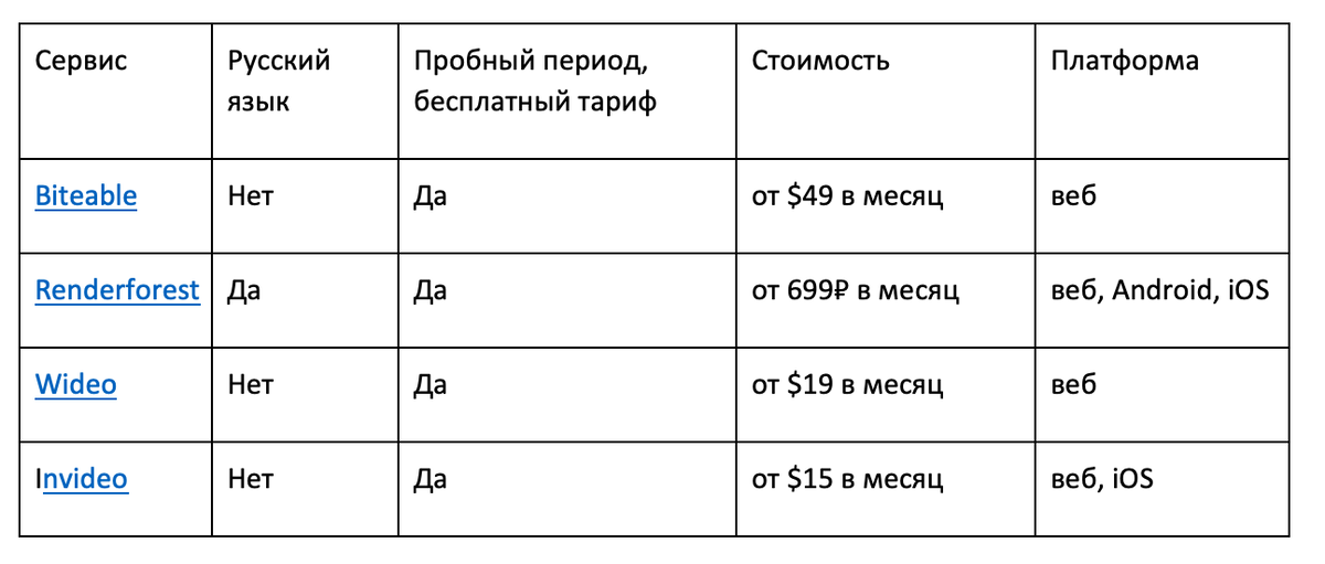 Начнем со сводной таблицы. Выбирайте сервис по душе! Платформы будем изучать по схеме: возможности, нюансыиспользования, плюсы-минусы, тарифы.