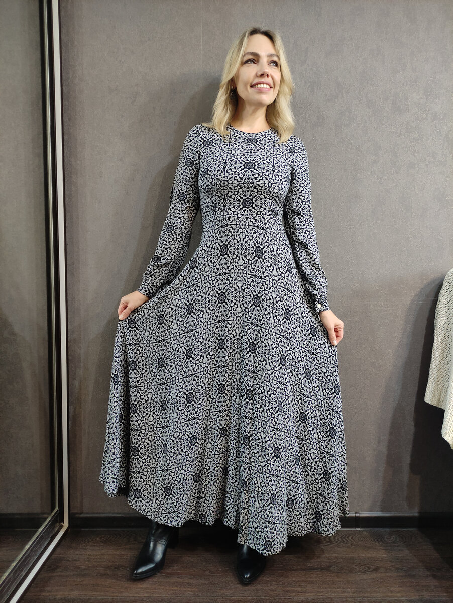 Надеваю прекрасное макси-платье с расклешеной юбкой.