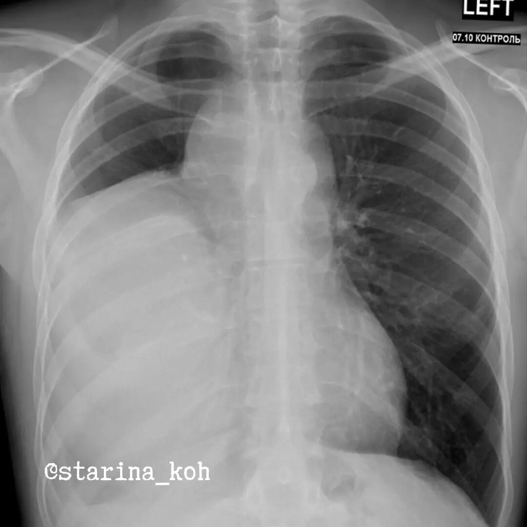 Мы привыкли, что любое упоминание о злокачественном процессе в грудной клетке ассоциируется у нас исключительно с раком - опухоли из эпителия бронхов/бронхиол. Редко, но бывают исключения. Как например, у этого молодого человека 36 лет - более чем за полгода до госпитализации по поводу ОРВИ была выполнена ФЛГ - в правом лёгочном поле найдено обширное затемнение (образование? гидроторакс?). До момента проведения ФЛГ пациента ничего особенно не беспокоило - периодический сухой кашель и неприятные ощущения в грудной клетке. Чуть позже выполнил КТ, где выявилось образование средостения. Через полгода после консультации онколога была выполнена повторная КТ ОГК, ОБП - где отмечалась отрицательная динамика по размерам опухоли, а подозрительные отдаленные очаги выявлены не были. Лабораторные показатели также были в норме. Без больших трудностей (согласитесь, в такую большую опухоль попасть несложно) выполнена трансторакальная биопсия - липосаркома миксоидного типа. Как можно было понять ещ