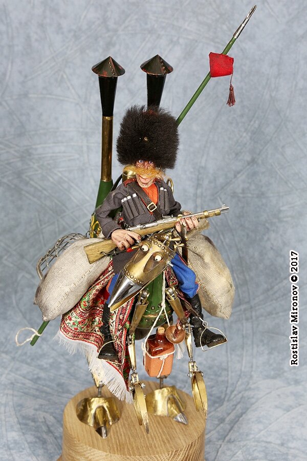 Дорогие друзья! Представляем еще одну работу Ростислава Миронова на выставке «Куклы с характером» в Кремле в Измайлово (до 20 декабря 2022 года). Ростислав Миронов - автор проекта «Русский стимпанк», серии «Стальная механическая гальваническая мощь Российской Империи» (несколько работ из этой серии представлены в экспозиции мастера на выставке). Знакомьтесь: Верховой механизм «Ж.П.-6» («Жар Птица») или как его называют в войсках — «жареный петух». Плод творческих сил народных умельцев — сельских кузнецов. Дешевизна и простота механизма сделали его весьма популярным в казачьих и других иррегулярных войсках…Грузоподъёмность до 100 пудов.Казак Архип Ипполитович Шекель. Отличился в Хаинкиойском обходе, в занятии Орхание и Этрополя.