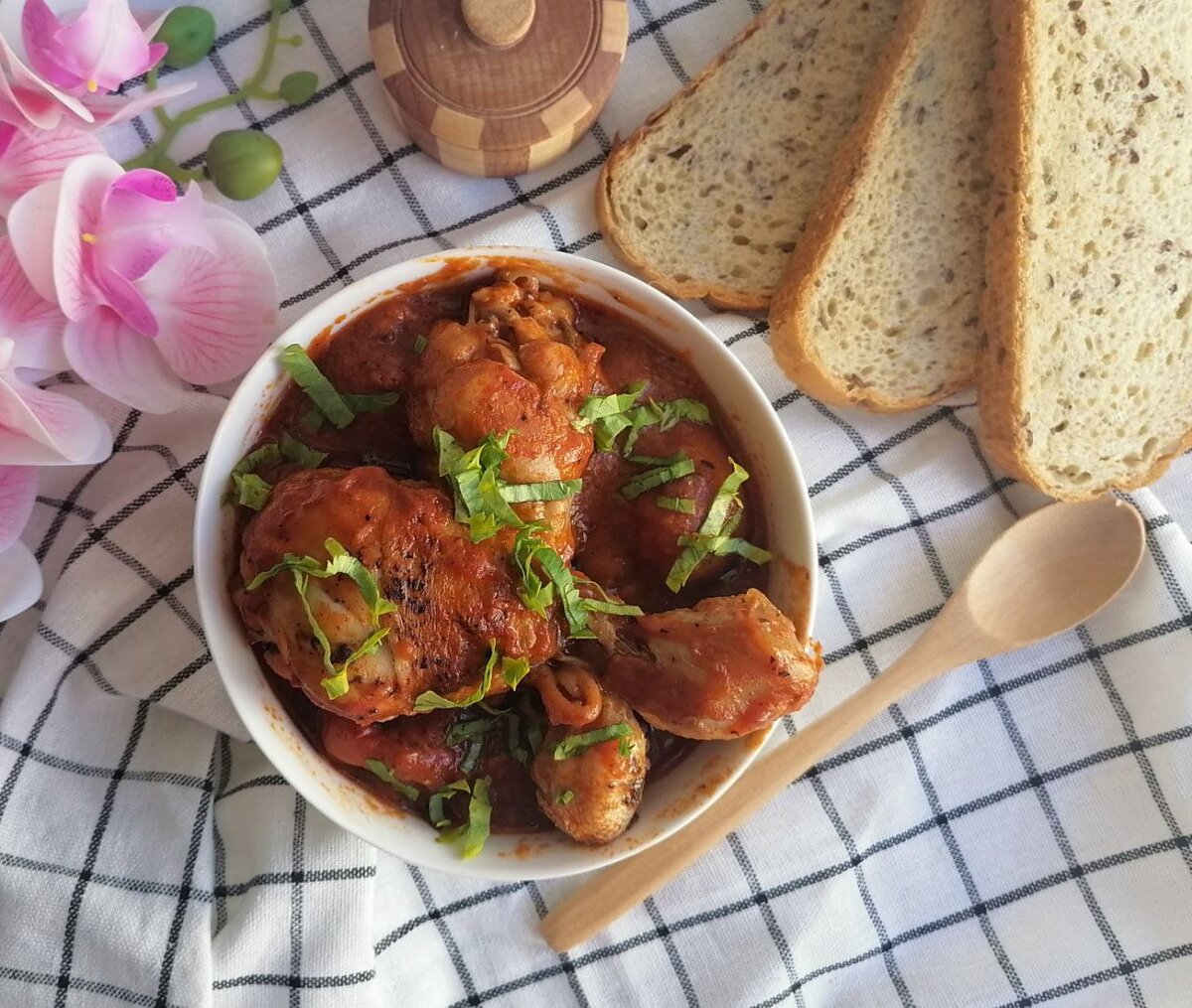 Продолжаю эксперименты по приготовлению куриных голеней. Вышло вкусно, съели быстро. Куриные ножки промыть, обсушить бумажным полотенцем. Натереть солью и перцем. Растопить сливочное масло на сковороде, добавить растительное и обжарить ножки со всех сторон и выложить на тарелку. Влить в эту же сковороде помидоры с соком, добавить томатную пасту, и травы. Довести до кипения. Вернуть курицу обратно в сковороду, посыпать измельченным чесноком. Готовить на медленном огне под закрытой крышкой около 1 часа. Приятного аппетита! Ингредиенты 8 куриных ножек 750 г консервированных помидоров 2 ст. л. томатной пасты 4 зубчика чеснока 3 ст. л. растительного масла 1 ст. л. сливочного масла сушеная зелень розмарина, базилика и петрушки по вкусу соль и перец #куриные ножки #рецепт #кулинария