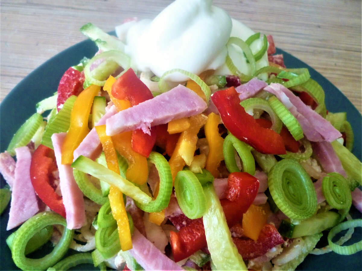 Такой салат пока не попадался мне на просторах интернета, возможно, он и вам покажется новеньким. Салат очень вкусный: свежий и хрустящий за счет перчиков и огурчиков и, в то же время, достаточно сытный и насыщенный за счет ветчины и яиц. Заправлять же можно по вкусу: майонезом или сметаной. Вкусно в обоих вариантах. У нас на этот счет даже разделились мнения. Поэтому салат сразу не заправляю: пусть каждый заправляет тем, что ему больше нравится. Нам потребуется: Перцы (желательно, разноцветные) 2шт Огурец свежий 1шт Лук (в идеале порей, но можно и обычный) 1шт Ветчина 100-150г Яйцо 2шт(отварить) Соль Красный молотый перец Майонез или сметана. Приготовление: Перцы и огурец нарезаем соломкой, лук - кольцами или полукольцами. Ветчину нарезаем соломкой не слишком мелко. А вот яйца натираем на терке. Смешиваем все ингредиенты, посыпаем красным перцем и солью. Еще раз перемешиваем. Готово! А чем заправить - решать вам и вашим любимым.