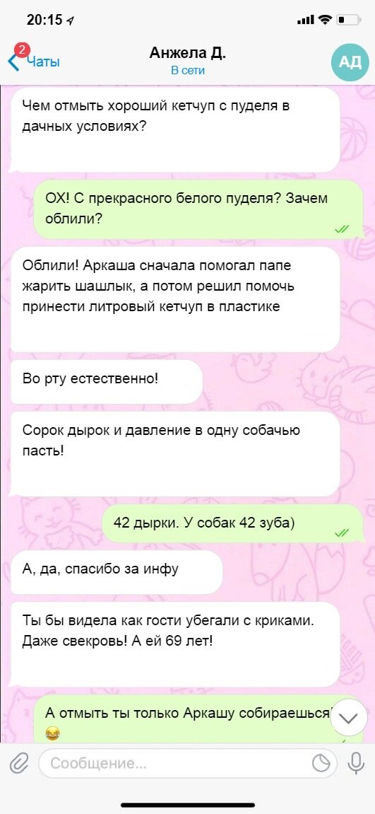 Буквально сегодня пришлось отрывать от себя чужого котенка. Очень хотел пойти со мной. Наверное, решил учиться на ветеринара. Хозяева не разрешили... А куда нам деваться от наших собственных, любимых хвостиков? Везде они с нами. Везде помогают... Сегодня смешные переписки именно о помощи на кухне или при готовке еды: Хозяйственным мылом! Если ничего нет (спец шампуней и т.д.) - то хозяйственным мылом помыть собаку можно. Только смывать водой градусов 38-39. Если холодной - Вы мыло не смоете. Да и собаке не понравится. Еще одна переписка о коте и... блинах. Кот взят из приюта и блины обожает. Но кота в блинах ограничивают. Коты на выдумку очень хитры. Отвлечь хозяйку, чтобы своровать - чем не талант?! Еще одна переписка об искренней помощи на кухне: Искренне же хотели помочь? Что тут скажешь?! И напоследок, переписка о помощи очень большой собаки... Одна девушка стала встречаться с парнем. А у парня дома кавказская овчарка. Очень уж сложно налаживать отношения с Дусей-Дульсинеей... Особ