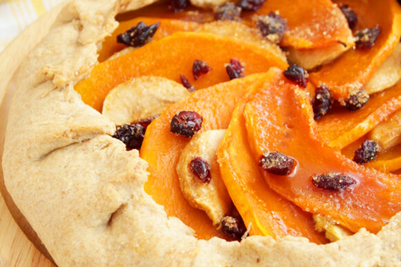 Тонкое хрустящее тесто и мягкие кусочки плодов в качестве начинки. Для основы вам понадобится смесь из пшеничной и цельнозерновой муки, вода, соль и сливочное масло. Тыкву и яблоки перед запеканием желательно щедро посыпать сахаром, чтобы дольки приобрели аппетитную карамельную корочку.