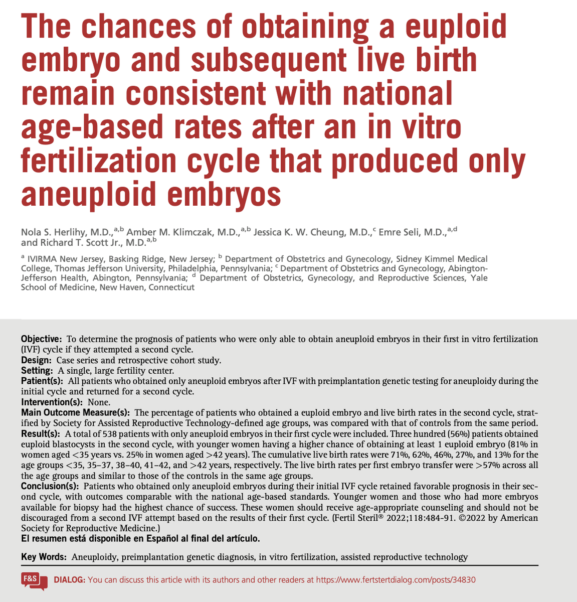 Авторы изучили результаты последующих циклов у женщин, у которых первоначальный цикл ЭКО привел ко всем анеуплоидным эмбрионам , и определили, что 56% женщин получили по крайней мере
