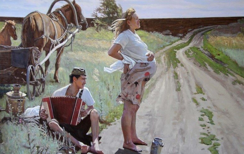 Старше меня лет на 5-10, в синих халатах и белых платках, толстые они были не менее безобразны, чем я в своем пальто. И насколько же я была удивлена, когда девчата не обращая внимания на красоту Санечки вручили ему вилы и прибаутками по матери стали «грузить» его работой.