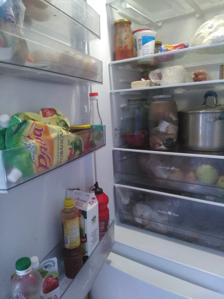 Давно я собиралась разморозить холодильник, да всё никак руки не доходили, а сегодня выходной, думаю, займусь этим сразу, прямо с утра. Муж меня поддержал, говорит, правильно, размораживай сегодня, всё равно он пустой. Я аж поперхнулась, как пустой? Вчера полный был. Муж открыл дверцу, погипнотизировал немного и грустно произнёс - Согласен, холодильник полный. А перекусить нечего. Ну да. Совсем нечего! На нижней полке кастрюля наваристого борща, пять литров, там же рядом банка маринованых огурцов и банка ягодного компота. Летние заготовки уже в ход пошли, да. Там же ещё скумбрия солёная в банке, сама я солила в рассоле, пойдёт сегодня на ужин с варёной картошечкой. Что ещё? Банка сметаны и сливочное масло из магазина. Домашние яйца, творог домашний и сыр из настоящего молока, это всё мы на рынке покупаем два или три раза в месяц. Ветчина тоже с рынка. Это совсем нечего? Пол банки аджики с хреном, муж покупал у знакомой бабульки. И что-то ему в этот раз не понравилось, поэтому осталас