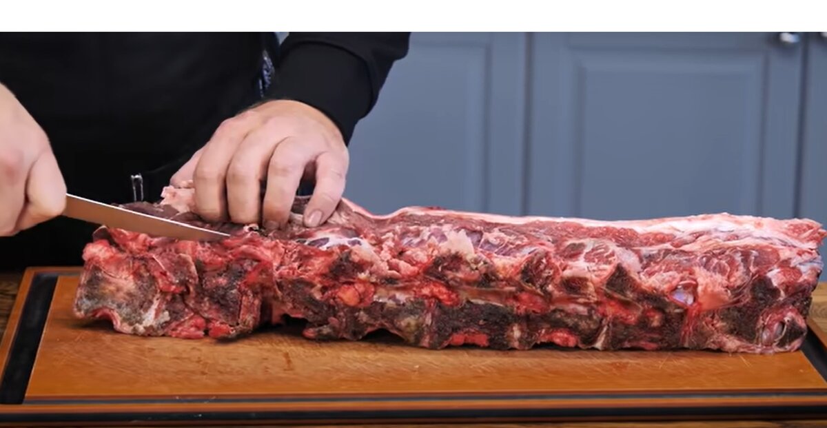 растительное масло Как приготовить Первым делом срезаем мясо с кости — вдоль хребта — и зачищаем его от плёнок. Теперь нарезаем мясо крупными кусками, толщиной примерно по 5 см. Нарезанное мясо надо положить в посуду, в которой будет его у