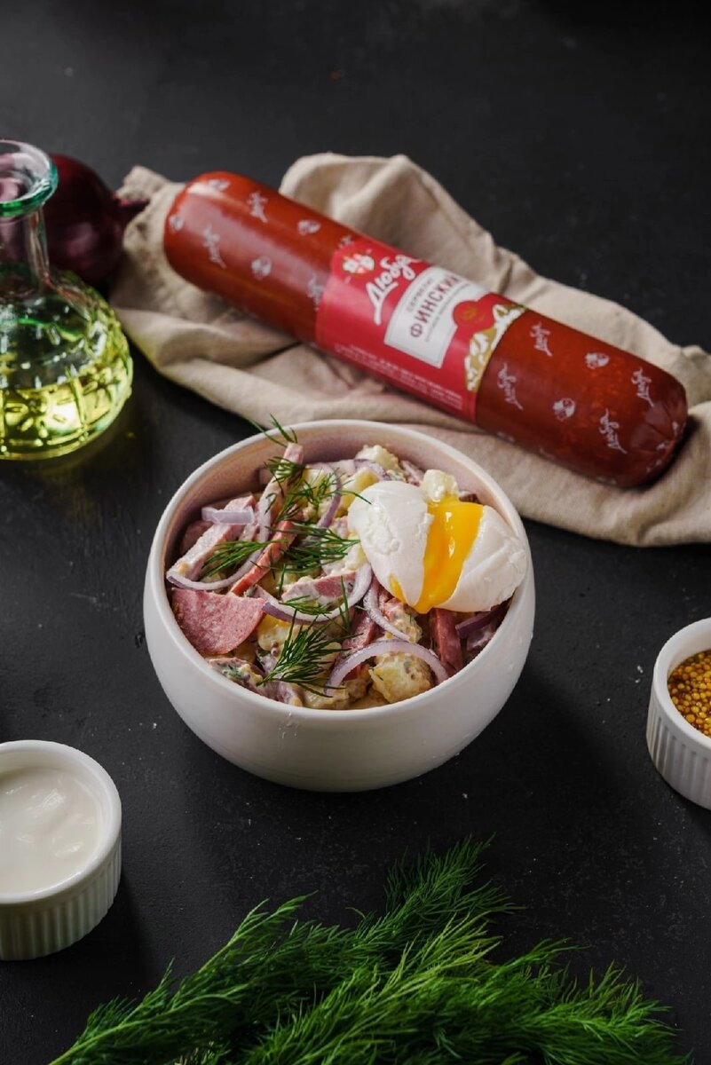 Попробовать необычное блюдо можно не только в ресторане, но и приготовив его самостоятельно. А оригинальная подача как в лучших заведениях, позволит приятно удивить гостей и семью. Основной ингредиент блюда – финский сервелат «Дюбуа», настоящая находка для мясных салатов. В составе сервелата 100% говядина, натуральные специи и пряности. Помимо этого вам понадобится картофель, красный репчатый лук, майонез, маринованные огурцы, оливковое масло, дижонская горчица, смесь перцев и зелень укропа. Способ приготовления: