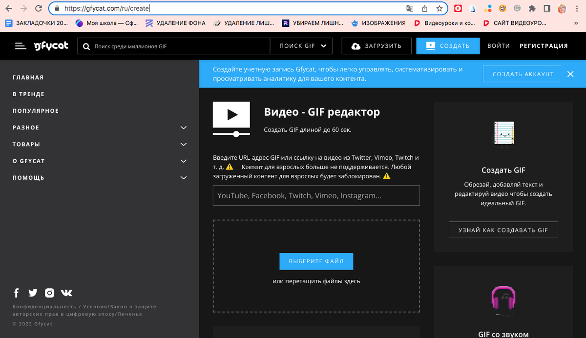 👉https://gfycat.com/ru Сервис позволяет легко и просто создавать гиф-анимацию и скачивать уже имеющиеся даже без регистрации. Созданный гифк можно встроить на сайт, в презентацию... Им можно поделиться. Сервис русскоязычный, что значительно упрощает работу в нём. Пользуйтесь с удовольствием и создавайте свои gif-шедевры! Удачи в работе!