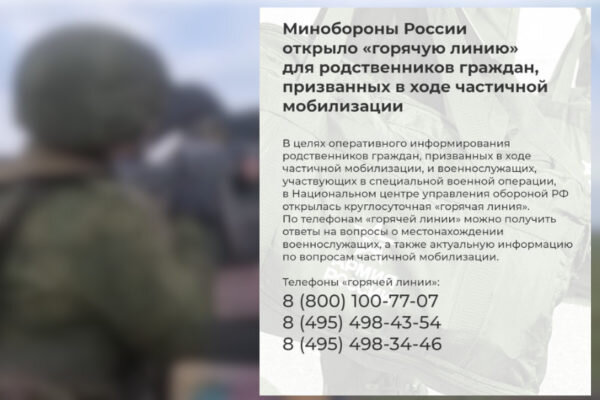 Министерство обороны РФ сообщило об открытии «горячей линии» для родственников россиян, призванных в рамках частичной мобилизации. Уточняется, что по телефонам «горячей линии» можно узнать о местонахождении военнослужащих, а также получить ответы на вопросы о частичной мобилизации. Телефоны кол-центра: 8(800) 100-77-07 , 8(495) 498-43-54, 8(495) 498-34-46.