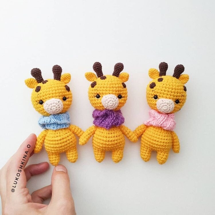 Крошечный жираф, который с легкостью поместится в ладошке. Смотрите схему вязания жирафа амигуруми крючком от Ольги Лукошкиной. Материалы: Условные обозначения: КА — кольцо амигуруми вп — воздушная петля сбн — столбик без накидка пр — прибавка уб — убавка (…)*n раз — повторить указанное в скобках n раз (12) — количество петель в конце ряда Схема вязания жирафа амигуруми Тело и ноги Ноги (2 детали) Желтой пряжей, крючок 2.25 мм 1: 6 сбн в КА (6) 2: (1 сбн, пр)*3 (9) 3-5: 9 сбн (3 ряда) Нить обрезать. У второй ножки нить не отрезаем, продолжаем вязать тело: От второй ножки набираем 2 вп и присоединяем к первой. 6: 9 сбн по первой ножке, 2 сбн в 2 вп, 9 сбн по второй ножке, 2 сбн в 2 вп (22) 7: (пр, 1 сбн)*4, 3 сбн, (пр, 1 сбн)*4, 3 сбн (30) 8-12: 30 сбн (5 рядов) 13: (3 сбн, уб)*6 (24) 14: (2 сбн, уб)*6 (18) 15: 18 сбн 16: (1 сбн, уб)*6 (12) 17: 12 сбн Оставить длинный конец нити для пришивания детали. Голова Желтая пряжа, крючок 2.25 мм 1: 6 сбн в КА (6) 2: (пр)*6 (12) 3: (1 сбн, пр)*
