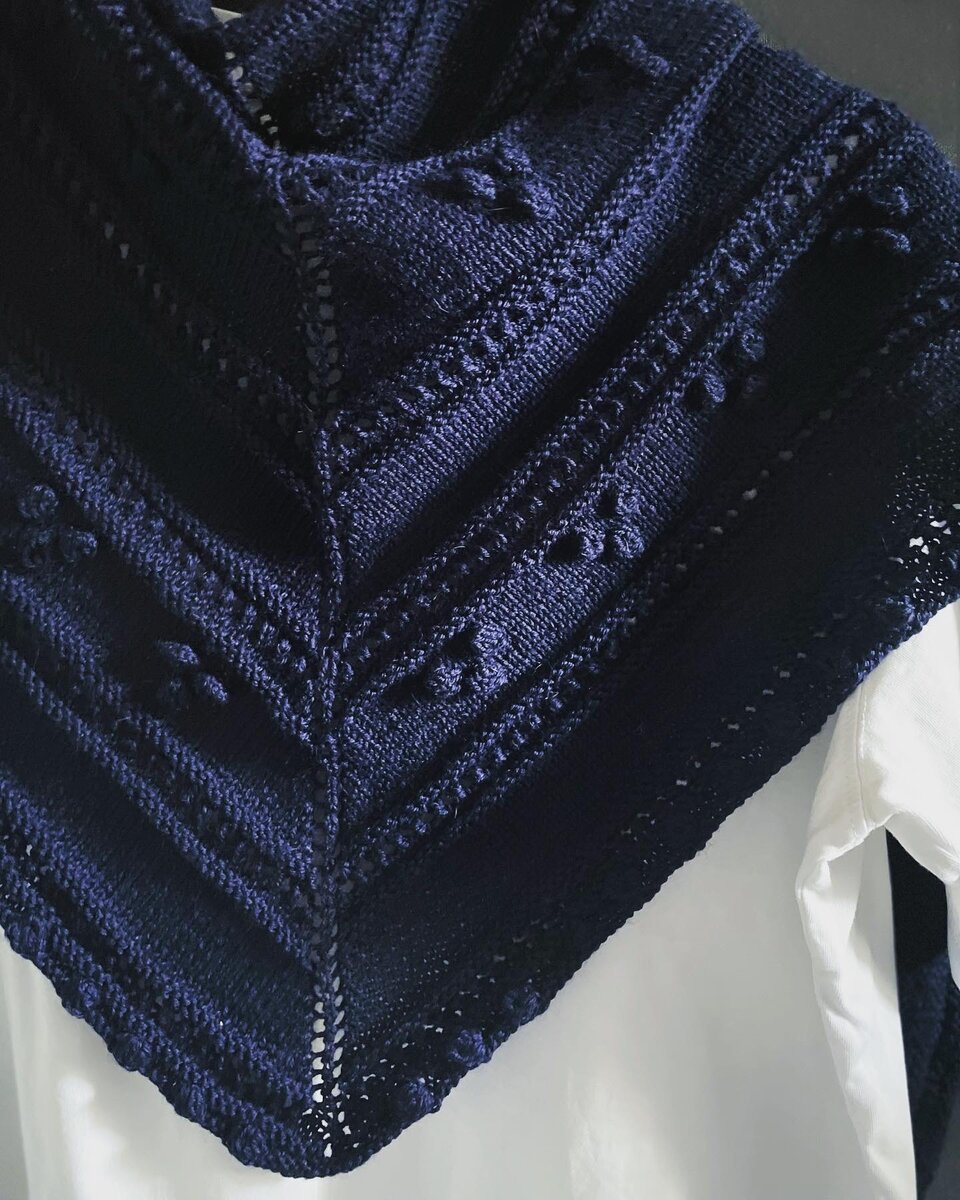 Существует три известных мне способа вязания треугольных шалей: снизу, сбоку и сверху. А ещё он может быть связан с узором, гладью, пряжей разной толщины и расцветок. Это всё дело вкуса и выбора.