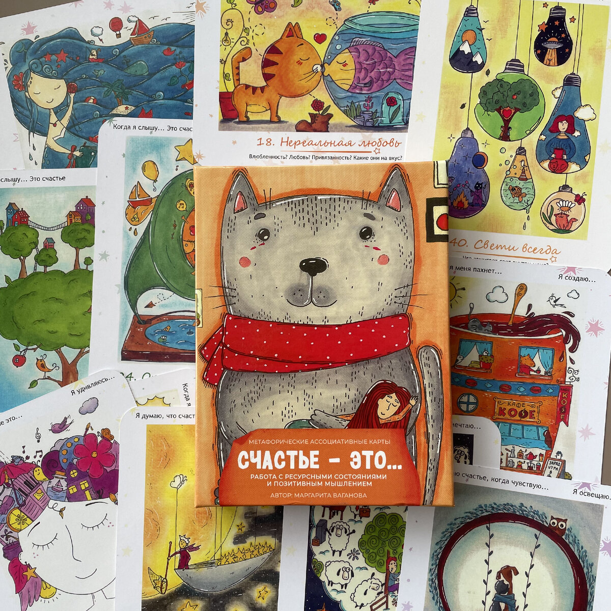 Хочу познакомить вас с солнечной, радостной колодой «Счастье — это». Это колода для работы с ресурсными состояниями и позитивным мышлением. Кроме того, она отлично подходит для общения с детьми. В колоде 44 карты. Автор: Ваганова Маргарита – психолог-игропрактик, специалист по МАК. Художник-иллюстратор: Эдуард Оганян. Что особенного в колоде? Например, одна из карт называется «Вишенка на торте». На ней есть вопрос: «Каково удовольствие на вкус?» А сверху — предложения, которые нужно закончить: «Моё счастье на вкус…», «Я люблю…» На каждой карточке вы можете поработать только с изображением, а можете расширить с помощью формулировок. Это интересный и полезный ход, особенно если вы покупаете колоду для себя, чтобы поддерживать и искать ресурсы. Приятно и удобно, когда карта сама задаёт вам вопросы. В чём идея колоды? Идея колоды — разложить счастье на разные модальности: есть карточки, которые посвящены вкусу, цвету, запаху, звукам. Карты задают вопросы и приглашают поразмышлять и собрать