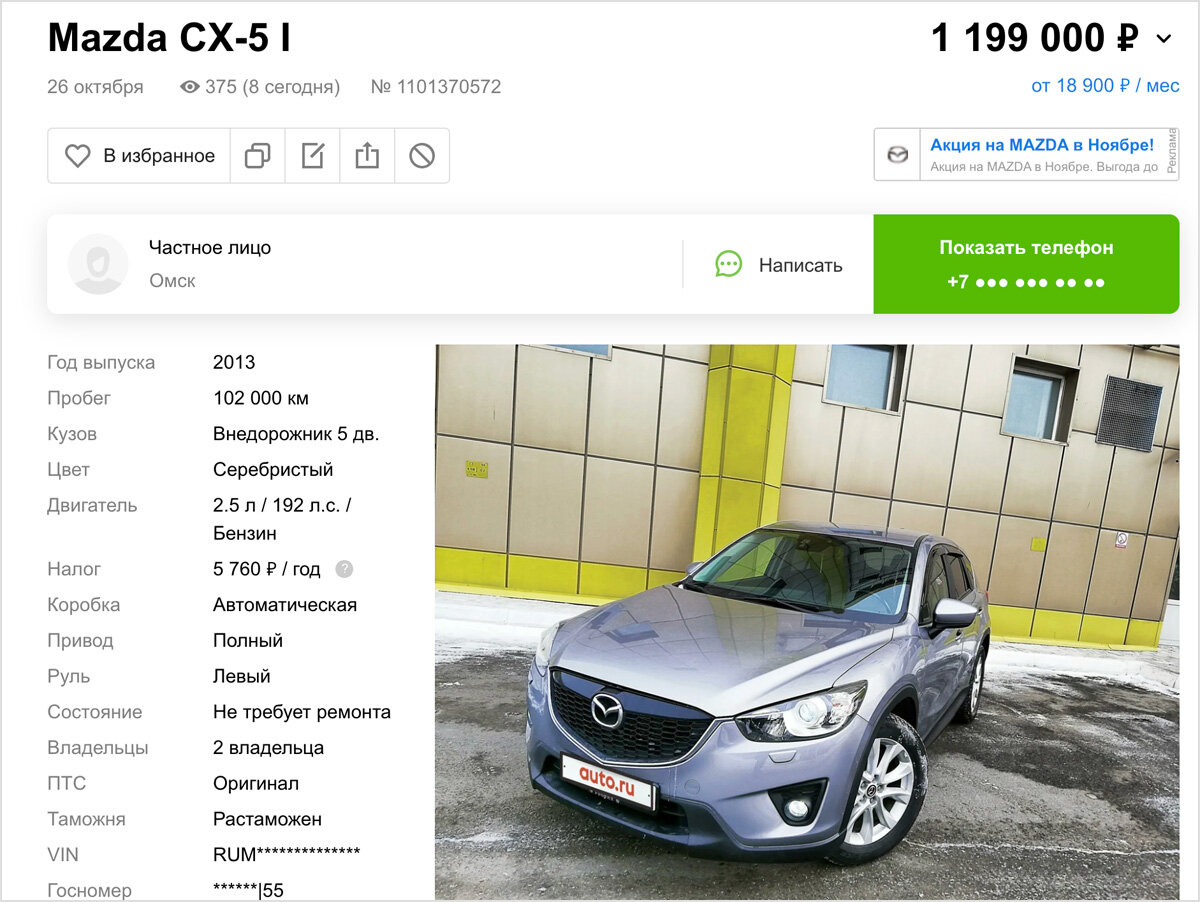 Но похоже, все эти действия с СХ-5 не прошли для него без следа. Иначе как объяснить, что такой популярный на вторичке автомобиль его второй владелец продаёт уже почти год? Сначала через автосалон (один из крупнейших в регионе, если верить объявлению), куда машину поставили на комиссию. А теперь вот самостоятельно, но кроссовер снова «завис».