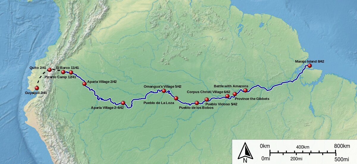 Во-первых, да: это то же время, экспедиция Писарро-Орельяны по большей части состоялась в 1542 году, предварительный её этап тянулся в 1540. Во-вторых, это тоже просто чертовски далёкий поход с исследованием (практически открытием) великой реки — только уже не Миссисипи, а Амазонки. Экспедиция провальная с точки зрения поставленных целей, но буквально бесценная научно — равно как у де Сото.