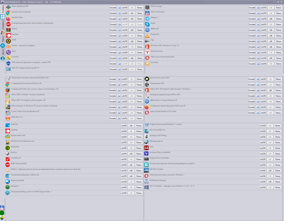 Список программ изображён на скриншоте выше. Это набор из моего пост установщика, хотя он и “цепляет” кое-что то Сергея Стрельца, но в целом в Live CD есть свои наборы. Перечислять программы текстом не вижу смысла. Во-первых, для каждого они свои, а во-вторых, желающие увидят всё, собственно, на скриншоте. Эта статья нацелена на некоторые замечания по списку, ссылки на источники, а также то, чего на скринах нет