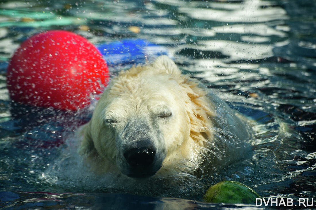 Медведь Алмаз прибыл в Хабаровск из Якутии год назад. И за короткий срок стал самым популярным животным зоосада «Приамурский», обогнав в этом субъективном рейтинге даже льва. Секрет успеха кроется в возрасте – детской открытостью к миру и любопытством он покорил всех. - Алмаз очень любит публику. Когда он видит детей, то готов бесконечно плавать и нырять. А также кидать зрителям свои пластиковые игрушки, требуя потом их возврат. Такая работа с аудиторией дала свои плоды – его показательное кормление стало самым популярным в нашем зоосаде, - рассказала Анна Новикова, заместитель генерального директора зоосада. В день белый медведь съедает шесть килограммов рыбы и столько же мяса. Но этим он не ограничивается – еще в ежедневный рацион входят овощи и фрукты. А особенно он любит арбузы и тыквы. - За этот год вес Алмаза увеличился с 286 килограммов до 370. Он уже освоил несколько команд, среди них взвешивание, лежать и дать лапу. Их приходится еженедельно применять, чтобы следить за состоян