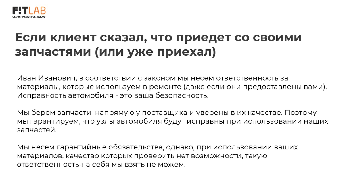 Совет № 1 Продавайте свои запчасти еще ДО того, как клиент приедет на СТО. Рассказывайте о преимуществах покупки у вас. Это может быть на этапе входящего звонка или подготовки к визиту клиента. Совет № 2 Если клиент хочет приехать со своими запчастями — работайте с возражениями. Большая часть клиентов по нашему опыту на этапе звонка в СТО только планирует купить запчасти. Совет № 3 Если клиент уже купил запасные части — продолжайте работать с возражениями. Объясните его финансовую выгоду, расскажите о рисках. Совет № 4 Если клиент уже приехал с запчастями на ремонт, а вы не готовы на этих условиях его обслуживать — откажите красиво. Без категоричного: " У нас такие правила". У нас есть кейсы, когда клиенты сдавали в магазин не только запчасти, но и масло. Автор: Ирина Кулиева, руководитель центра обучения FITLAB