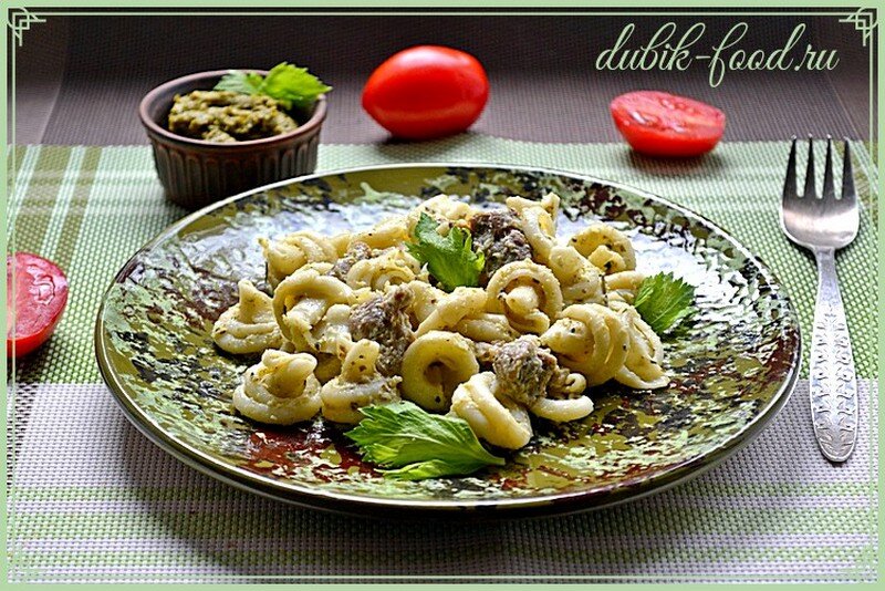 На разогретом оливковом масле обжарить чеснок и индейку. Смешать сливки, натертый сыр, соус песто, соль, перец и сушёный базилик. Вылить к индейке получившийся соус. Готовить на среднем огне до расплавления сыра. Приготовить макаронные изделия согласно инструкции на упаковке.