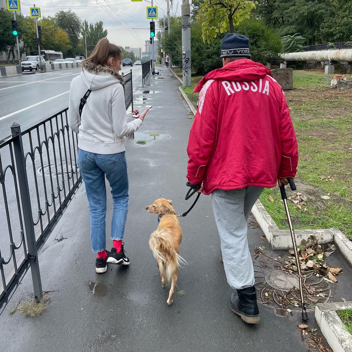 Через 5 минут видим, как довольный дедушка ведет свою любимицу на поводке. Клава была приободрена, ее выдавал хвост, который метался по сторонам. Я не особо различаю эмоции людей, но на его лице была умеренная радость.