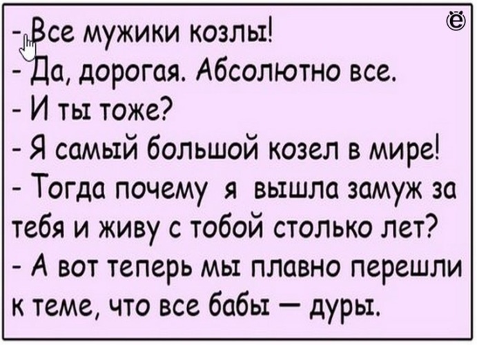 Сегодня поговорим про негативные установки. Если женщина говорит "все мужики козлы", то именно таких она и будет встречать в своей жизни, тем самым подкрепляя свою установку. И связано это с избирательностью нашего внимания. Мозг совершено точно фиксирует наши установки и настраивает фильтры внимания именно на них. Для мозга эволюционно важна стабильность, а установки её дают. Ведь зачем рассматривать всех мужчин, проще выбрать уже знакомого "козла". Легко и быстро!) Именно по этой причине, чтобы не нарушать цельность психики, эту женщину бессознательно будет тянуть к "козлам". И причины этого только в ней, а не в том, что все мужчины реально козлы!) P.S. с "все бабы стервы" такая же ситуация...