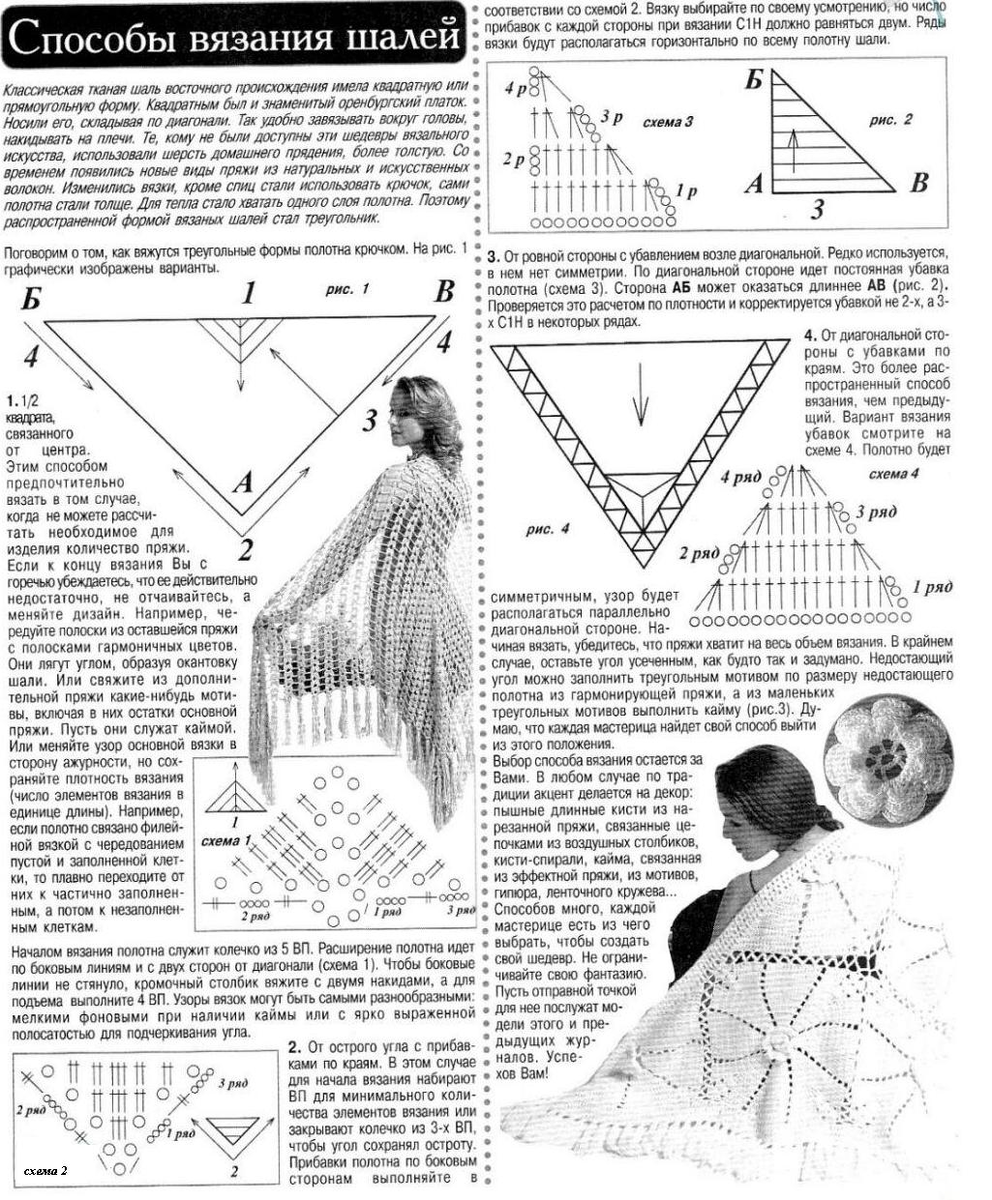 Прохладным летним вечером или холодным зимним, одинаково приятно завернуться в ажурную шаль, палантин или пончо... А праздники - это время, которое хорошо потратить на интересное хобби и с пользой... Итак, в этой статье - советы для начинающих как вязать треугольную шаль, несколько схем ажурных шалей для любого уровня мастерства. Совет: для летних моделей выбирайте хлопчатобумажные нитки или с небольшим содержанием шерсти, потоньше, для зимних - натуральную шерсть или мохер. Совет: стирать и полоскать вязаные изделия надо аккуратно, в воде постоянной температуры, чтобы не свалялись. Любое вязаное изделие сушить лучше положив на плоскую решетчатую поверхность на плотной хб ткани в расправленном виде. Совет: схема - не догма, если хотите, то поэкспериментируйте с нитками, их цветом и текстурой, попробуйте другую ажурную обвязку края, приделайте кисточки попышнее и т.д. Фантазируйте и ваша шаль станет действительно уникальной!