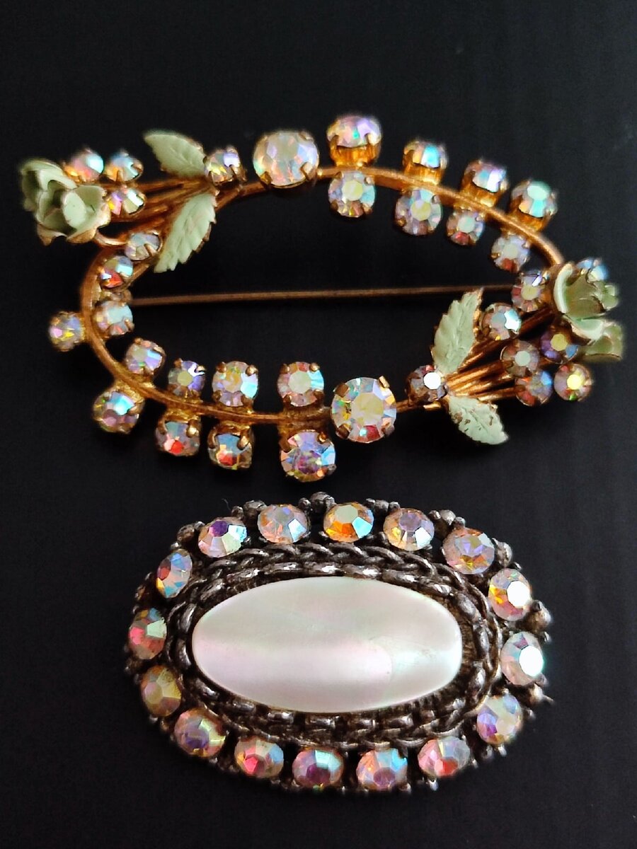 Еще не знаете, что такое Аврора Бореалис? Так это броши, кристаллы которых имеют радужные переливы. Чаще всего они встречались во времена СССР в виде светлых круглых, овальных брошей или брошей с подвесками, которые мерцали светлыми пастельными оттенками. Более точно про этот термин можно узнать из статьи «Аврора Бореалис. Уникальное открытие в мире бижутерии» (ссылку на нее оставлю ниже)
