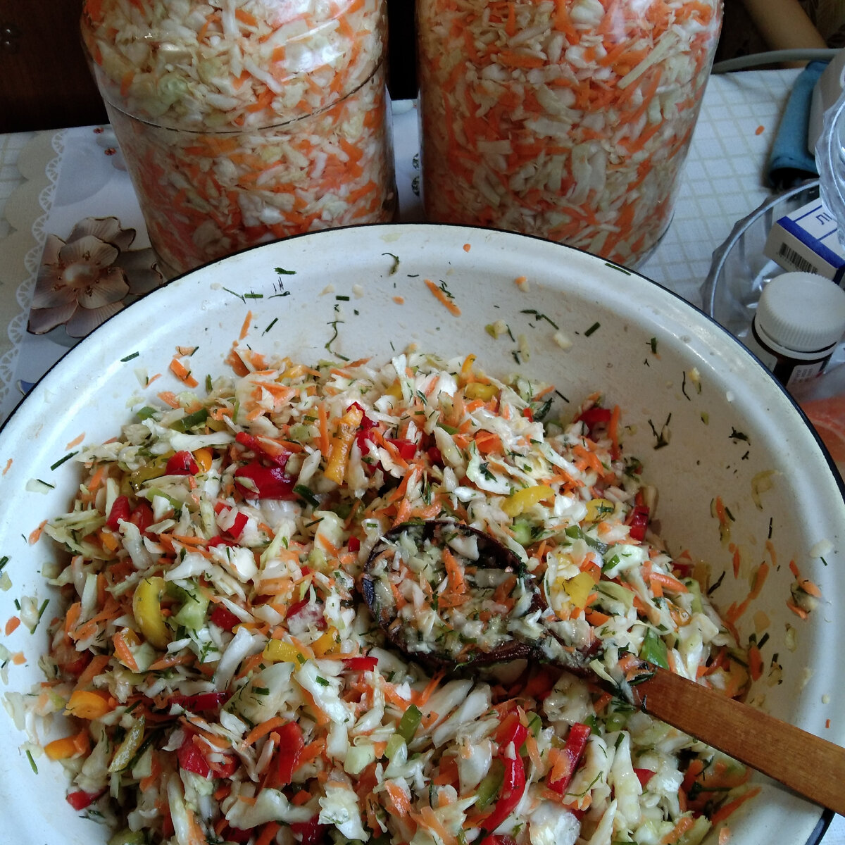 Еще из одного качана приготовила салат из капусты, моркови и сладкого перца. Этот салат можно есть сразу. Рецепт ЗДЕСЬ.