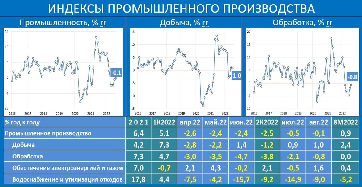 Производство России в августе: в моменте ситуация выглядит неплохо • ИПП: -0.1% vs -0.5% гг в июле; 8М2022: 0.9% гг • Добыча: 1.0% vs 0.9% гг; 8М2022: 2.4% гг • Обработка: -0.8% vs -2.1% гг; 8М2022: 0.0% гг Росстат оценил августовскую сезонно-сглаженную динамику в -0.8% mm sa vs 1.2% mm sa месяцем ранее. В добыче хоть и в меньшем, чем в июле, но все еще в минусе находится уголь (-2.2% гг), а также металлические руды (-7.5% гг). Нефть – в небольшом плюсе (1% гг), прочие полезные ископаемые (10.3% гг) Ситуация в обработке восстанавливается благодаря некоторым “тяжеловесным” позициям: металлургия (4.1% гг), готовые мет.изделия (16% гг), машины и оборудование (9.1%) - в двух последних позициях присутствуют военные заказы. В плюсе и лекарства (14.3% гг). В то же время снизились нефтепродукты (-1.1% гг) и довольно мрачная ситуация сохраняется в производстве автотранспорта (-42.9% гг)