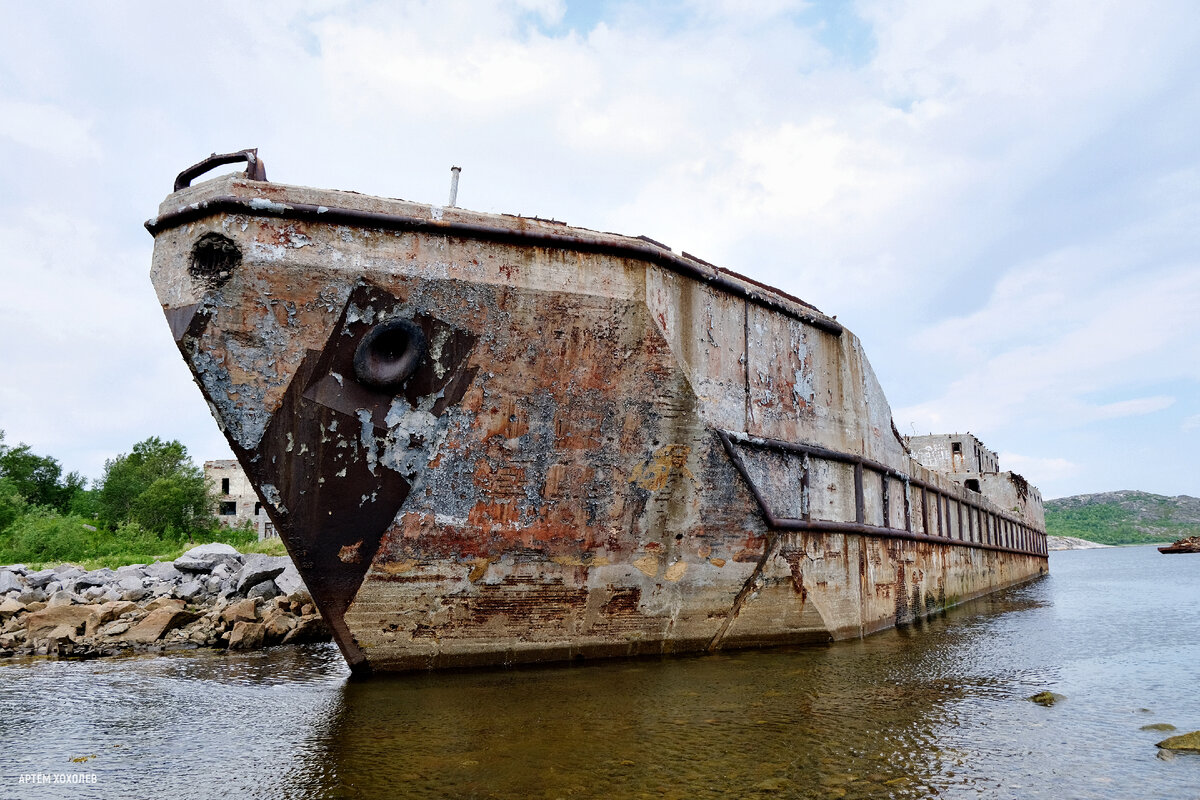 В забытом гарнизоне на берегу Кольского залива сохранился необычный бетонный корабль, в советские времена служивший плавучей базой снабжения Северного Флота. Увидеть брошенное судно можно в покинутом военными моряками заполярном посёлке Горячие Ручьи. До развала Советского Союза здесь располагалась бригада разведывательных кораблей, морской радиотехнический отряд разведки Северного флота и даже база по подготовке диверсантов-подводников. Именно в Горячинской бухте базировались уникальные корабли разведчики ССВ-501 "Запорожье" и ССВ-503 "Харитон Лаптев", позднее варварски брошенные и порезанные на металл. Сейчас посёлок напоминает декорации к фильмам про зоны отчуждения без людей или мировой апокалипсис - щербатые здания зияют мертвыми глазницами, причалы давно сгнили и даже металлисты, распилив гордость советского флота, покинули Горячие Ручьи. Осталось только загнанное на мель бетонное судно-хранилище длинной во внушительные 72 метра. С высоты квадрокоптера корабль выглядит еще боле