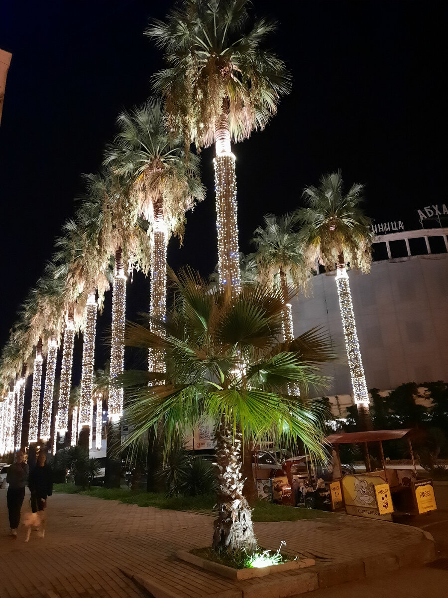 Мы два раза гуляли вечером в темноте по городу. И оба раза шли пешком от нашей Садовой улицы и потом обратно. Это означает, что живём мы недалеко от набережной, где красота вечерняя. Уже по пути туда есть такие красиво подсвеченные дома и они выглядят замечательно! А на набережной, конечно,главное - пальмы, которые образуют аллею. Днём они не привлекают сильного внимания потому-что между ними сделана стоянка для машин. А вот в темноте пройти мимо невозможно. Вечером можно увидеть выставку-продажу картин. В феврале она работала днём, а сейчас только вечером. Мы заметили, что вечером гуляет много местных, а не только отдыхающих. В кафе сидят в основном мужчины. А молодёжь просто ходит. Гуляют и семьи с детьми. В "Нартаа" всегда много народа вечером. Всё же это самое популярное кафе на набережной. И оно этого (на мой взгляд) заслуживает. Ещё есть рестораны на причале и в здании морского Вокзала, хотя сам Вокзал так и не восстановлен Вечером всё выглядит немного краше и иначе, чем днё