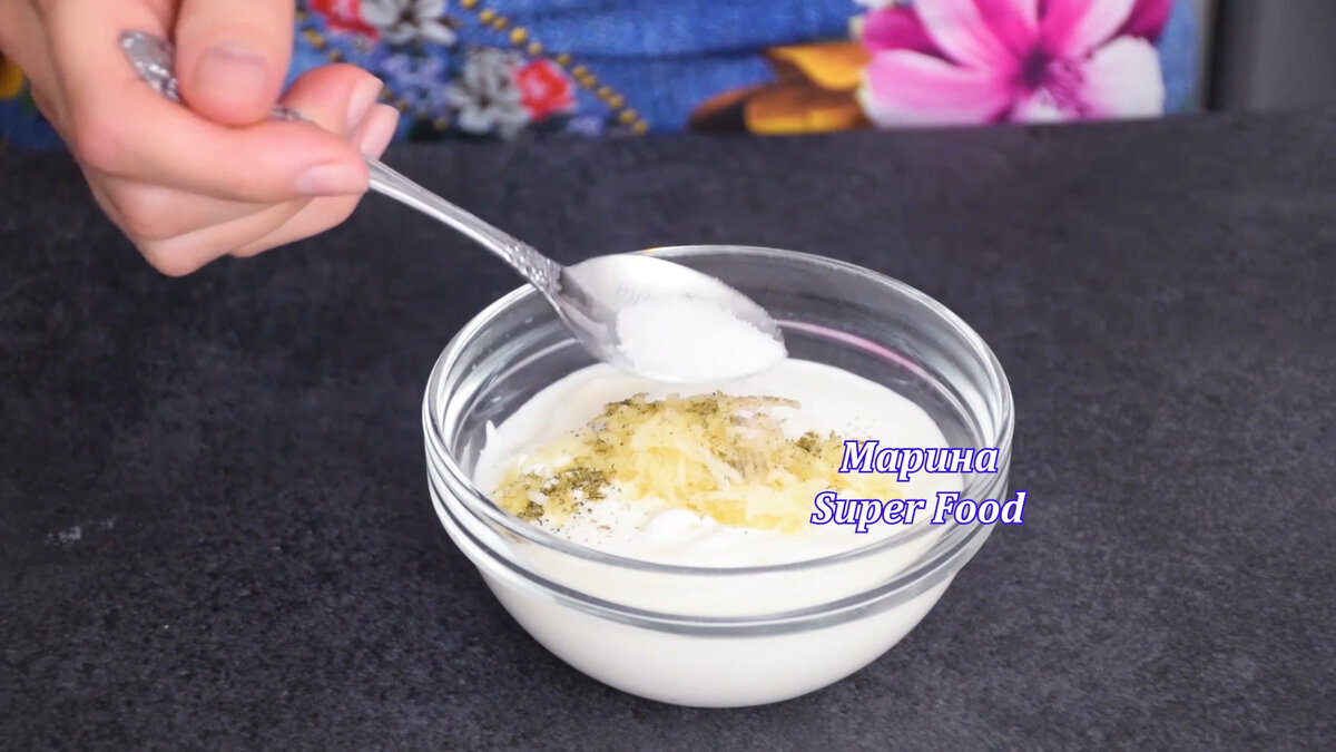 1. Сначала нужно подготовить соус, для этого свежий чеснок нужно измельчить. Я натираю на мелкой терке. В сметану добавляем измельченный чеснок, черный молотый перец и соль. Все хорошо перемешиваем.