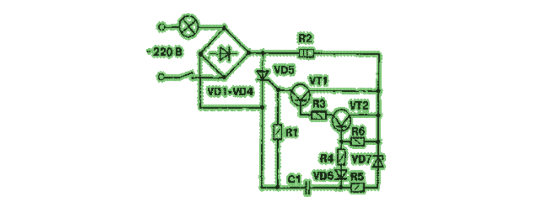 Устройство ставится и умещается в выключателе или рядом с ним. Оно позволяет плавно включать эл/лампу, т. е. до номинального значения увеличить ток через эл/лампу в течение 1 сек после ее включения. Это позволит значительно увеличить срок службы эл/лампы до 10-15 и более лет. Устройство ставится и умещается в выключателе или рядом с ним. Оно позволяет плавно включать эл/лампу, т. е. до номинального значения увеличить ток через эл/лампу в течение 1 сек после ее включения. Это позволит значительно увеличить срок службы эл/лампы до 10-15 и более лет. Причина быстрого разрушения нити накала эл/лампы заключается в том, что в момент включения из-за малого сопротивления холодной нити накала через нее протекает начальный импульс тока, во много раз превышающий номинальное значение. И как Вы замечали, лампа перегорает всегда во время ее включения. Схема позволяет работать с эл/лампами 100-200 вт. Обозначения. VD1-VD4 - КД105Б (для 100 вт) и КД202Ж, КД202С (для 200 вт) VD5 - КУ201К, КУ202К-Н У06-