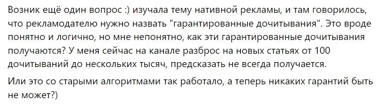 Получила следующий вопрос в комментариях. Раньше некоторые блогеры работали по схеме гарантированное число дочитываний статьи + доплата за дочитки сверху. Например, 5000 гарантированных дочитываний, а всё, что свыше оплачивалось 1 руб за дочитывание. Расценки могли быть и другие, это даю для примера. Гарантированное число дочитываний шло из среднего показателя, плюс брали стреляющую тему. Если дочитывания не набирались, то статью крутили при помощи бонусных показов. Если вдруг не застали бонусные показы, это такая "валюта" для внутреннего таргета по Дзену. Можно было дополнительно крутануть публикацию. Весной бонусные показы отменили, на Дзене произошли глобальные изменения. Сейчас гарантировать какие-то дочитывания просто невозможно, на мой взгляд. Поэтому просто берём фиксированную плату за публикацию и всё. Сколько брать, каждый решает сам. На Дзене до сих пор нет никакой формулы для расчёта стоимости рекламы.