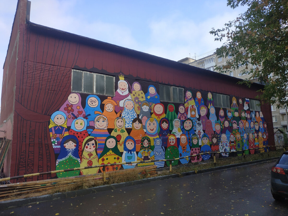 #граффити #граффитироссия #искуство #искусство #пермь #праздник #рисунок #детскийрисунок Скоро будет праздник - трëхсотлетие города Перми! К празднику делают новые дороги, чинят здания и много ещë чего. Пермь активно заполняется разными красивыми граффити, которые радуют глаз. Многие считают,что граффити - это не искусство, но я не согласна с ними. Граффити - это рисунок на стене, который украшает улицу, а не портит какое-то здание. Если у художника хорошие мотивы и он спросил разрешение хозяина здания, то он может нарисовать, то что порадует других. Художники тратят много времени и сил на то, чтобы разрисовать стену. Часто бывает, что стена ну уж очень высокая, поэтому им приходится использовать какие-нибудь конструкции,чтобы залесть на них. Сегодня я расскажу вам про одно из новых граффити в нашем городе, в рисовании которого я принимала участие. Граффити можно увидеть на здании центрального теплового пункта по улице Желябова, 17а. Автор проекта "Театр матрëшек" - Надежда Панова,
