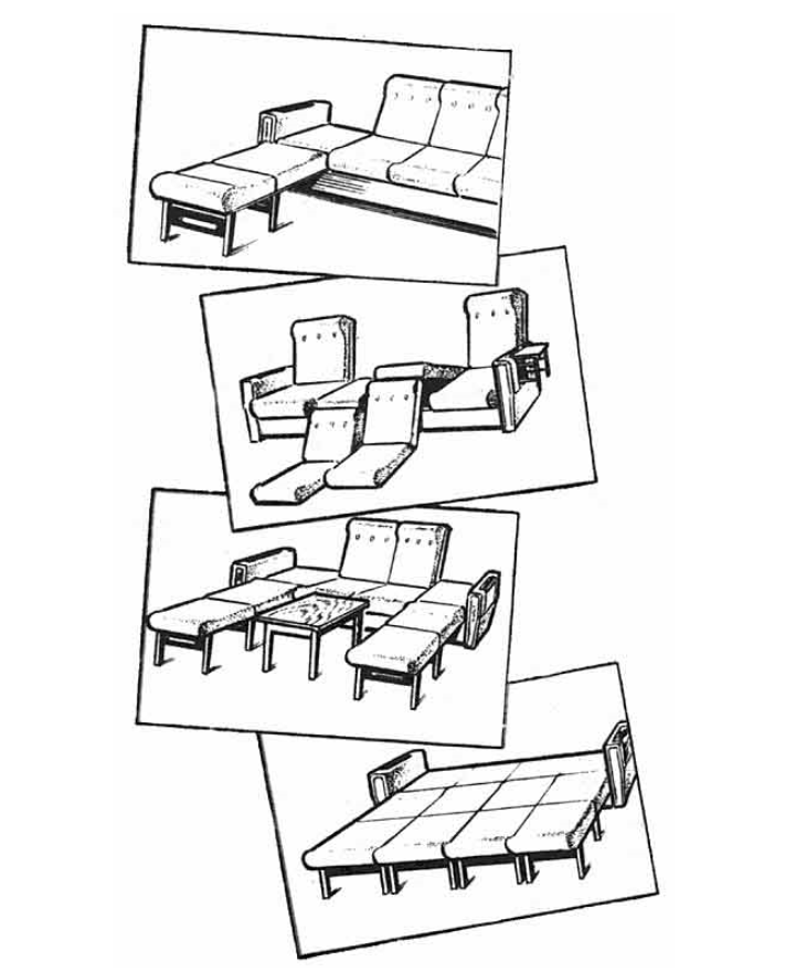 Идея дивана-"дастархана" появилась не случайно. К ней меня подтолкнуло неудобство пользования обычной мебелью в маленькой комнате общежития и впоследствии в однокомнатной квартире. За основу конструкции дивана я взял принцип раскладывающегося кресла-кровати, выбрав наиболее понравившуюся мне схему конструкции. Все детали "дастархана" — самодельные, так как промышленные меня не устраивали. Самый крупный элемент — это деревянный каркас, выполненный из сосновых досок. На него при помощи оконных петель крепятся четыре независимые друг от друга раскладывающиеся секции. Каждая имеет три шарнирных соединения. Применение в одной из них не оконной, а рояльной петли оправдано, так как в разложенном положении этот шарнир опирается на каркас и никакой нагрузки не воспринимает. Соединение всех деревянных деталей каркаса и раскладывающихся секций — в шип. Ножки дивана (и откидные у секций) сделаны из березы. Каждая секция имеет ширину 460 мм, зазор между ними — 5 мм. При сложенных средних двух секци