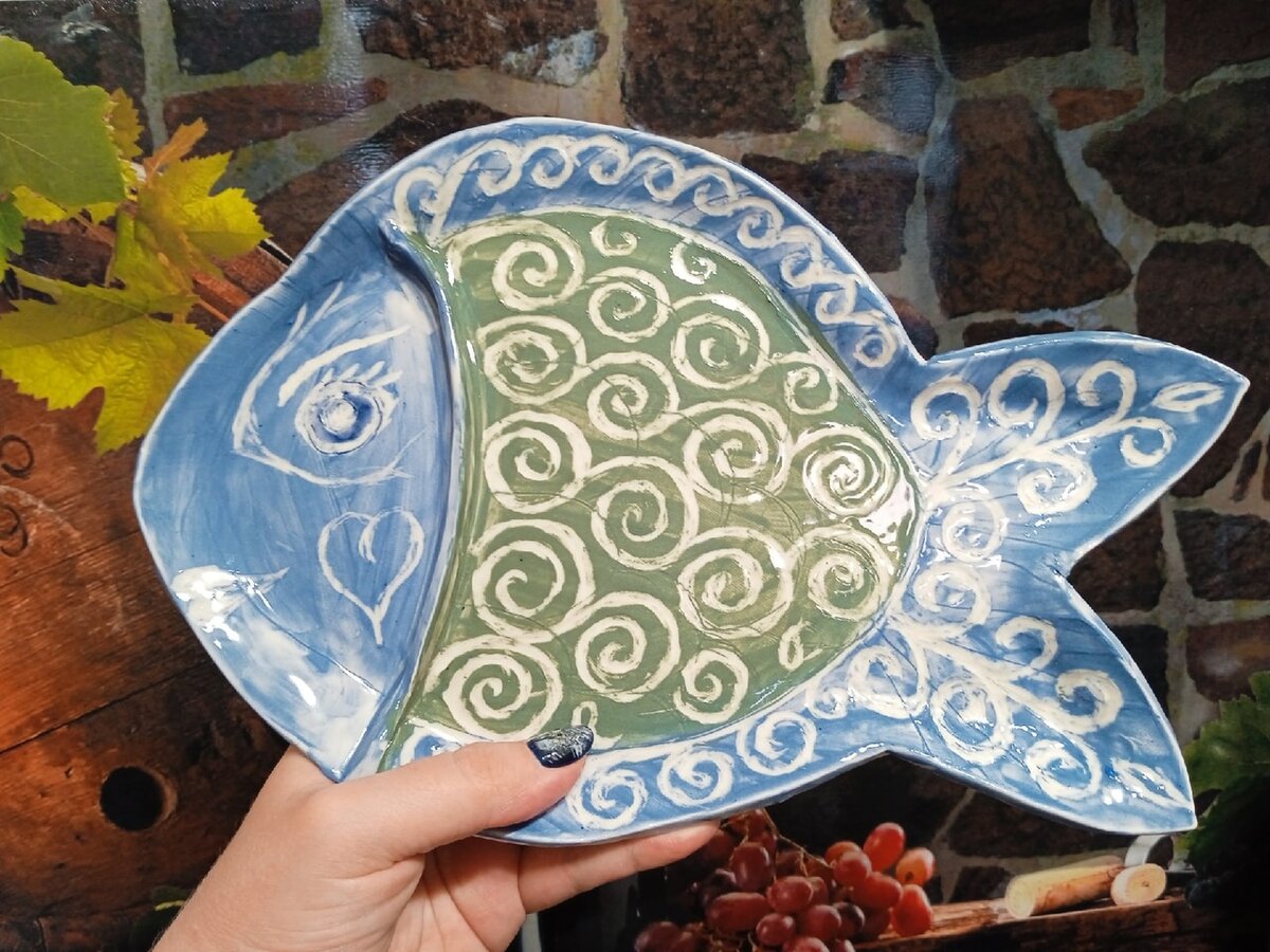 Готовое. Сегодня я забрала свою антистрессовую рыбу - тарелку. Не смотря на опасения, что она может не пережить обжиг, Рыбка пережила оба обжига, по звуку трещин нет, что лишний раз подтверждает мою теорию, что расстраиваться заранее и огорчаться от того, что только может быть, но пока не случилось, глупо и не рационально. Я, кстати, была спокойная. Решила, что даже если что-то произойдёт, значит так должно быть. Задачу минимум рыбка выполнила, пока я её лепила, я перегрузила голову и эмоции. Теперь рыбка дома и будет использоваться по назначению, пока не придёт её час.