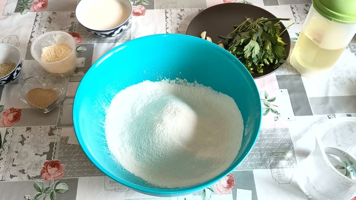 Индийские лепешки "Наан", что переводится как хлеб. Он так же распространен в странах востока. Понадобится: 150 мл теплой, кипяченной воды, 150 мл йогурта, 1 столовая ложка сухих дрожжей, 1 столовая ложка растительного масла, 50 грамм гороховой муки, 450 грамм пшеничной муки, 1/2 чайной ложки соли, 2 столовые ложки кунжута, 3-4 зубчика чеснока, небольшой пучок петрушки.