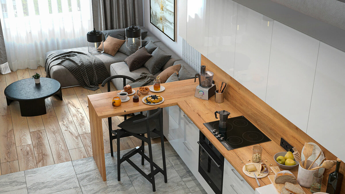 Вариантов разделить одну комнату на две множество. Использование барных стоек - частое практичное решение этой задачи, когда столешница выполняет функцию обеденного стола и визуально делит кухню на две части.