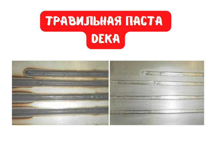 При сварке нержавеющих сталей в околошовной зоне происходит потеря хрома, появляются цвета побежалости и снижается коррозийная стойкость металла. Для удаления оксидного слоя и возвращения первоначального вида металлу рекомендуется использовать травильную пасту DEKA. Метод травления – это процесс очистки и обработки металлической заготовки, во время которого удаляется верхний слой с поверхности детали. Метод травления - эффективный и бюджетный способ обработки материала, помогает оперативно вернуть металлу первоначальный вид. Травильная паста DEKA удобна в использовании за счет желеобразной консистенции, паста легко наносится на поверхность детали. Возможно нанесение в труднодоступные места, а также нанесение на вертикальные швы. Использование травильной пасты помогает быстро вернуть изделию товарный вид и решить проблему с коррозийной стойкостью металла. Преимущества травильной пасты DEKA: - Эффективное травление металла - Простота применения - Возможность наносить в разных плоскостях