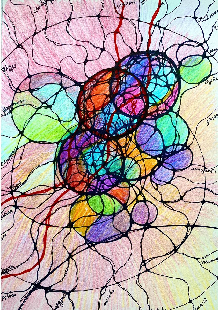 Хочу поделиться отзывом ученицы Наталии. «Рисую с Оксаной давно и знаю, что нейрографика — работает и многие мои желания уже исполнились. Но тема отношений для меня, как американские горки: то все вау и эйфория, то хочется рвать и метать и остаться одной. Я понимаю, что это неправильно, что нужно находить компромисс, разговаривать и развивать отношения. Вебинар «Гармоничные отношения» подкупил своим названием. Ведь именно гармонии мне сейчас так не хватает в моих отношениях с супругом. А еще мне очень хочется подарков! Хочется почувствовать себя желанной и чтобы без повода муж делал бы сюрпризы.Во время рисования очень горели щеки, пылали руки и вообще чувствовала себя утюгом, который может ошпарить, если прикоснешься. На этапе цвета „отпустило“:) Неожиданно мы с мужем стали очень похожими по цвету кругами (многоцветными, но цвета почти одинаковые), а между нами возник большой круг, соединяющий нас. Он и стал фигурой фиксации, но пока не знаю, про что он мне (мысли — идеи приходят, но