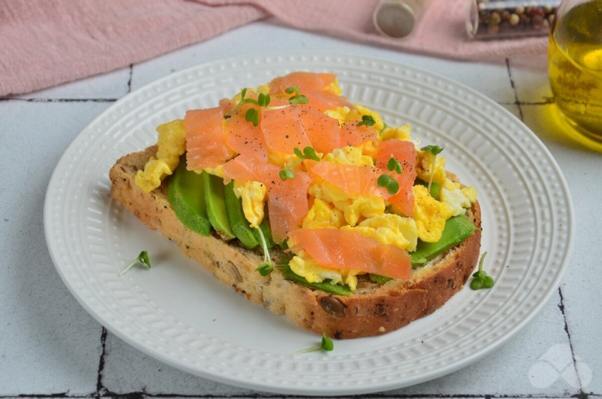 Ингредиенты Пошаговый рецепт приготовления Взбейте яйца со сливками и специями. Обжарьте на среднем огне, непрерывно помешивая скрэмбл лопаткой. Нарежьте очищенный авокадо тонкими дольками и выложите на хлеб. Сверху выложите скрэмбл. А на него – ломтики лосося. Приправьте бутерброды по мере необходимости.