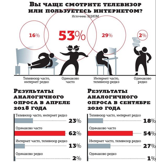 Телевидение медленно, но верно продолжает уступать интернету. Свежий опрос ВЦИОМ показал, что только 16% россиян постоянно смотрят ТВ, а интернетом пользуются раз в месяц или реже. Это минимальное значение за 4 года, в течение которых социологи исследуют медийные предпочтения аудитории. Количество тех, кто выбирает мировую паутину, а телевизора избегает, соответственно, обновило максимум — 29%. Самой стабильной группой остаются те, кто старается держаться золотой середины. Или, как это изящно сформулировано в выводах ВЦИОМ, "реализует гибридную модель медиапотребления". Их доля вот уже 2 года балансирует между 52 и 55%, то падая, то поднимаясь. Сравнения "партии телевизора" и "партии интернета" обычно принято помещать в контекст отношения к пропаганде или подверженности её влиянию. Это фактор существенный, но не единственный. Не стоит следовать логике злобных сказочных правителей, казнящих гонца лишь за то, что он принёс плохие вести. В конце концов, любой экран или монитор — только ин