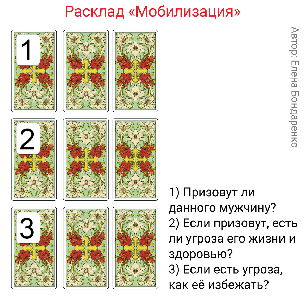 ⁉️ Сейчас приходится делать довольно много раскладов на мобилизацию. И меня часто спрашивают, какой именно делать расклад? ‼️ Я предлагаю вам не брать сложные схемы с большим количеством карт. Их будет сложно анализировать. Да и лишняя информация нам особо не нужна. Важно знать: призовут или нет и есть ли угроза жизни. ✅ Начните с простого расклада, например с такого, как предлагаю я. ✔️#расклад_схема