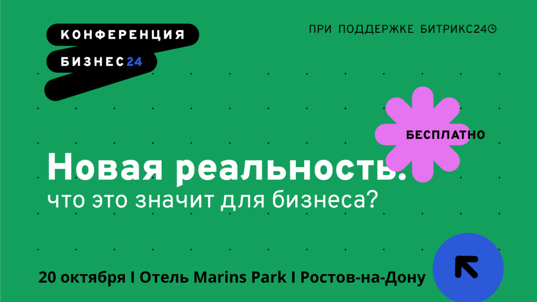 Когда в бизнесе что-то не так, предприниматели действуют методом проб и ошибок. Настало время объединиться и не повторять ошибки друг друга. Участвуйте в бесплатной конференции Бизнес24 в Ростове-на-Дону 20 октября. Наконец-то можно встретиться офлайн с бизнес-сообществом, зарядиться позитивом, поделиться проблемами и найти решения. Приходите и получите инсайты от коллег, эффективные инструменты управления, которые помогут пройти любой шторм, практические советы от экспертов. Офлайн | 6 полезных докладов | 70+ деловых знакомств Вы узнаете: Думаете, будет слишком сложно? Вы разберетесь с тем, что происходит в бизнесе в целом, найдете для себя возможности для роста, узнаете, как работают технологии и каких результатов можно добиться. А уже после конференции, вы сможете постепенно внедрять изменения, увидите эффект и будете удивляться: «а что, так можно было?». Почему участвовать важно: Конференция бесплатная для всех, кого коснулись изменения. Переходите на сайт, посмотрите программу, и