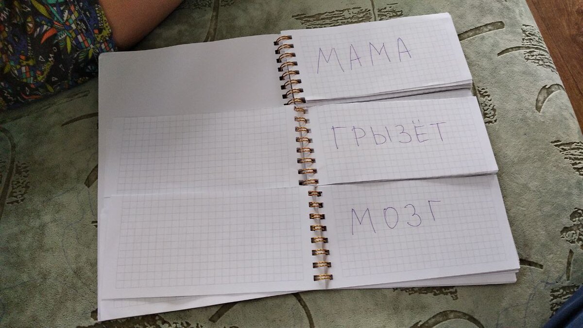 Самый лучший вариант это, конечно, отстать от ребенка и дождаться, когда он научится сам (или его научат в школе), но мы ж не из таковских, покой нам только снится. При этом учить по традиционной технологии (стол, стул, букварь) я не хочу. И дети не хотят. Скучно это нам. Ленивые мы. Обучаемся в игровой форме, на расслабоне, с шутками-прибаутками, конфетками. И результатом вполне довольны. Может, еще кому-то наши изыскания пригодятся. Способ №1: "Чепуха" Где-то я посмотрела идею, малость адаптировала и получилась игра, которую мы называем "Чепуха". Берется тетрадь на пружине. Блок разрезается поперек на три части. На каждой пишутся слова. - Верхняя строка - одушевленные существительные в ед. ч., Им. п. Это могут быть имена, названия животных и т. д. - Средняя строка - глаголы действия в наст. вр., ед. ч. - Нижняя строка - опять существительные, но уже в Р. п. По структуре получается "подлежащее - сказуемое - дополнение", если я еще не совсем забыла синтаксис. Звучит дюже сложн