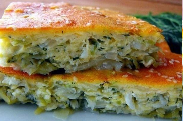 Ингредиенты: -Капуста белокочанная (молодая) — 500 г -Яйцо — 3 шт -Сметана — 5 ст. л. -Майонез — 3 ст. л. -Мука — 6 ст. л. -Соль — 1 ч. л. -Разрыхлитель теста — 2 ч. л. -Укроп — 1/2 пуч. -Кунжут (для посыпки) Приготовление: Капусту нашинковать, подсолить и слегка обмять. Добавить мелко нарезанную зелень. Яйца взбить в однородную массу. Добавить остальные ингредиенты и замесить тесто. Форму смазать сливочным маслом и выложить в неё капусту Залить тестом и посыпать сверху кунжутом. Поставить форму в разогретую до 180 градусов духовку, выпекать 30 минут до образования золотистой корочки. Для начинки можно использовать варёный рис + рыбная консерва, яйца + зелёный лук, курица + шампиньоны.